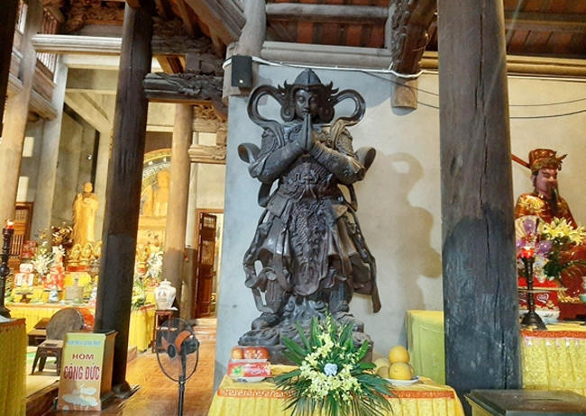 Gian chính của tòa Tam Bảo có hai pho tượng hộ pháp, được đúc nguyên khối bằng gốm, cao 2,5 m. Các nghệ nhân đã mất hơn một năm để hoàn thiện tác phẩm này. Đây là những tác phẩm độc bản, thể hiện tinh hoa của những nghệ nhân tài năng trong làng nghề.