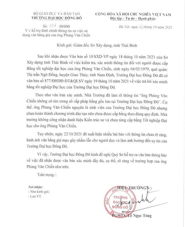 Bên cạnh đó, trường Đại học Đông Đô cũng đề nghị Sở Xây dựng tỉnh Thái Bình xác minh đầy đủ, cụ thể, rõ ràng về trường hợp của ông Phùng Văn Chiến để tránh làm ảnh hưởng đến uy tín của ngôi trường này.