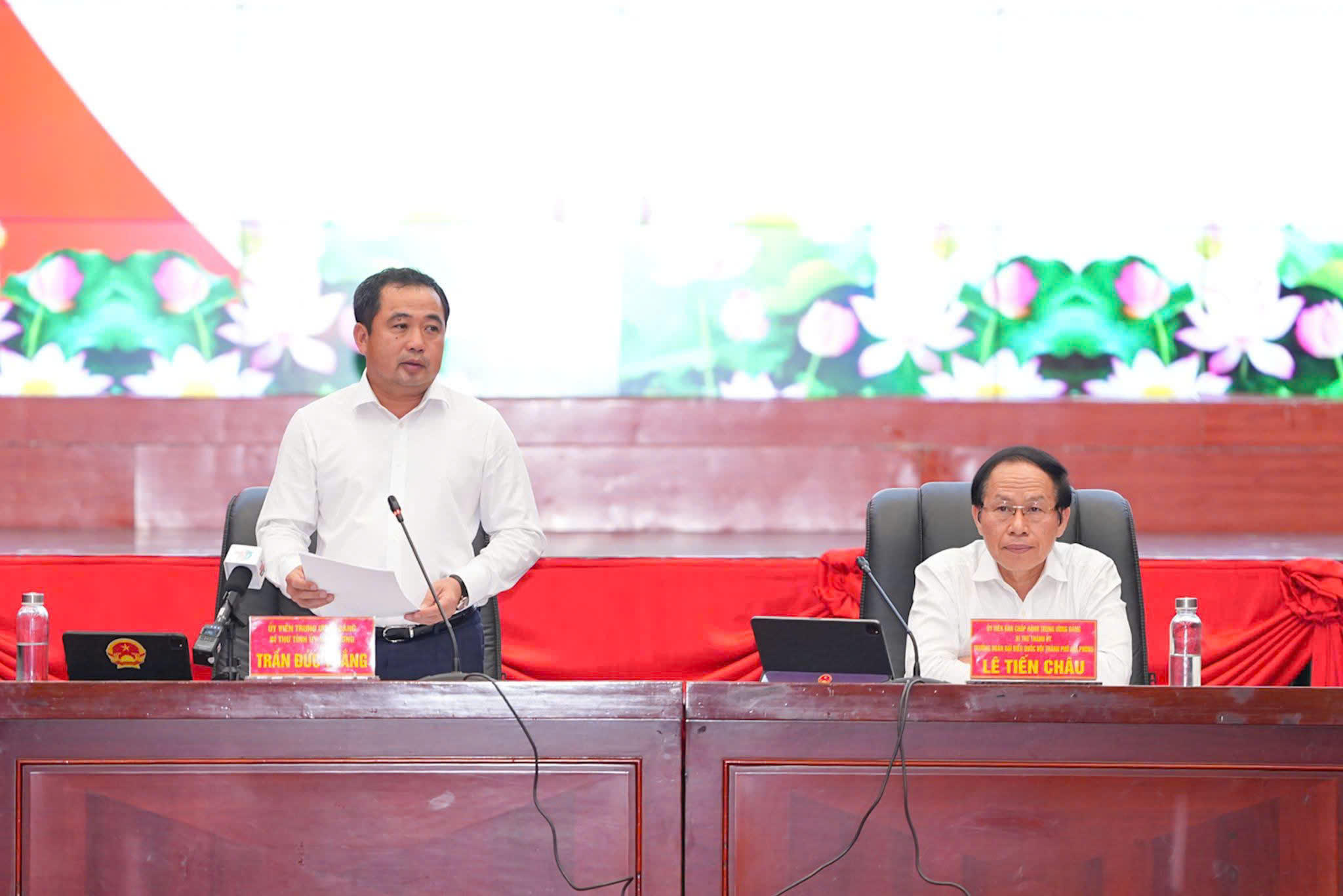 | Ông Lê Tiến Châu, Ủy viên Trung ương Đảng, Bí thư Thành ủy, Trưởng Đoàn Đại biểu Quốc hội TP Hải Phòng phát biểu tại hội nghị |
