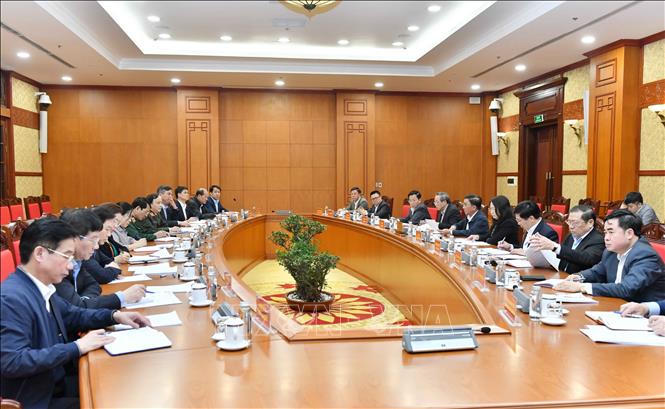 Đồng chí Trần Cẩm Tú, Ủy viên Bộ Chính trị, Thường trực Ban Bí thư chủ trì giao ban. Ảnh: Phương Hoa/TTXVN |