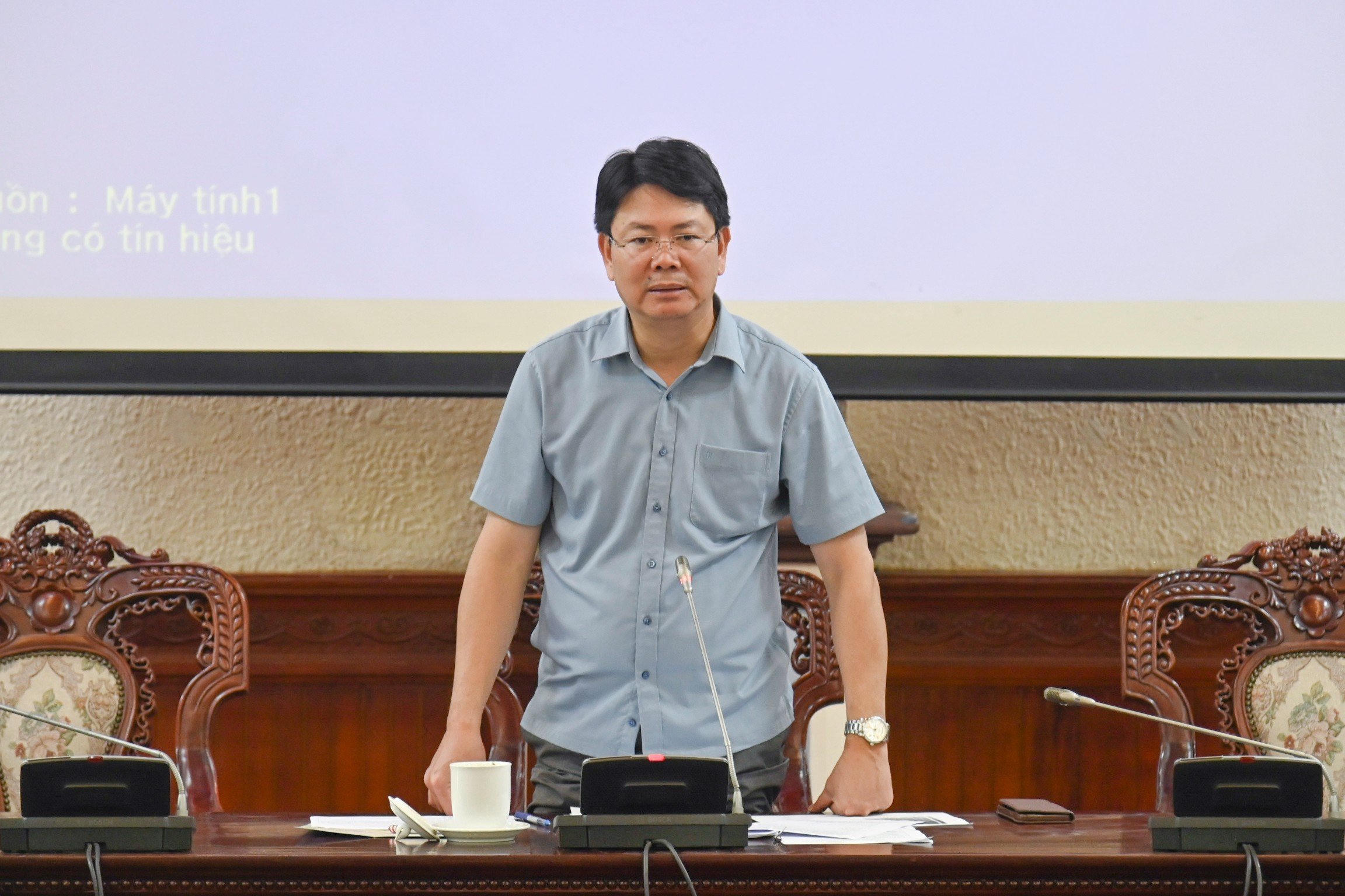 Phó Cục trưởng Cục Phổ biến giáo dục pháp luật Phan Hồng Nguyên báo cáo tại cuộc họp. |