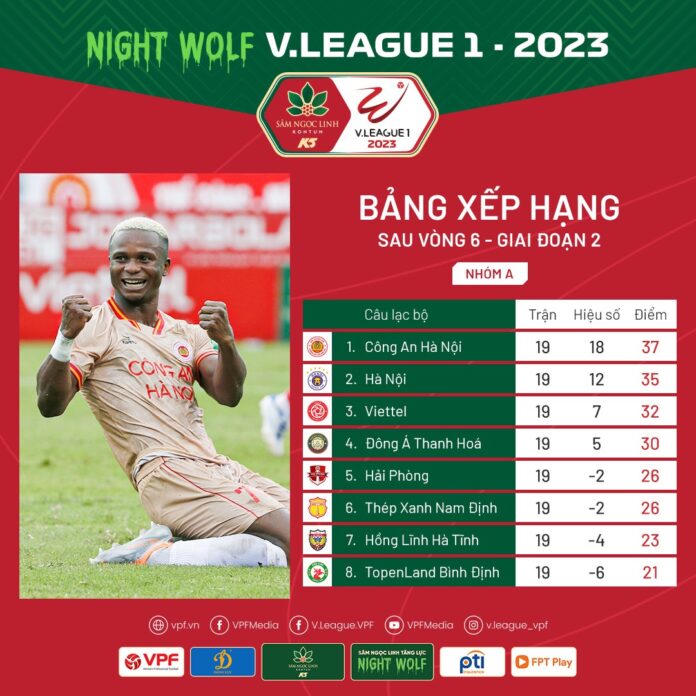 Bảng xếp hạng CLB nhóm A sau vòng 6 GĐ2 Night Wolf V.League 1-2023: |