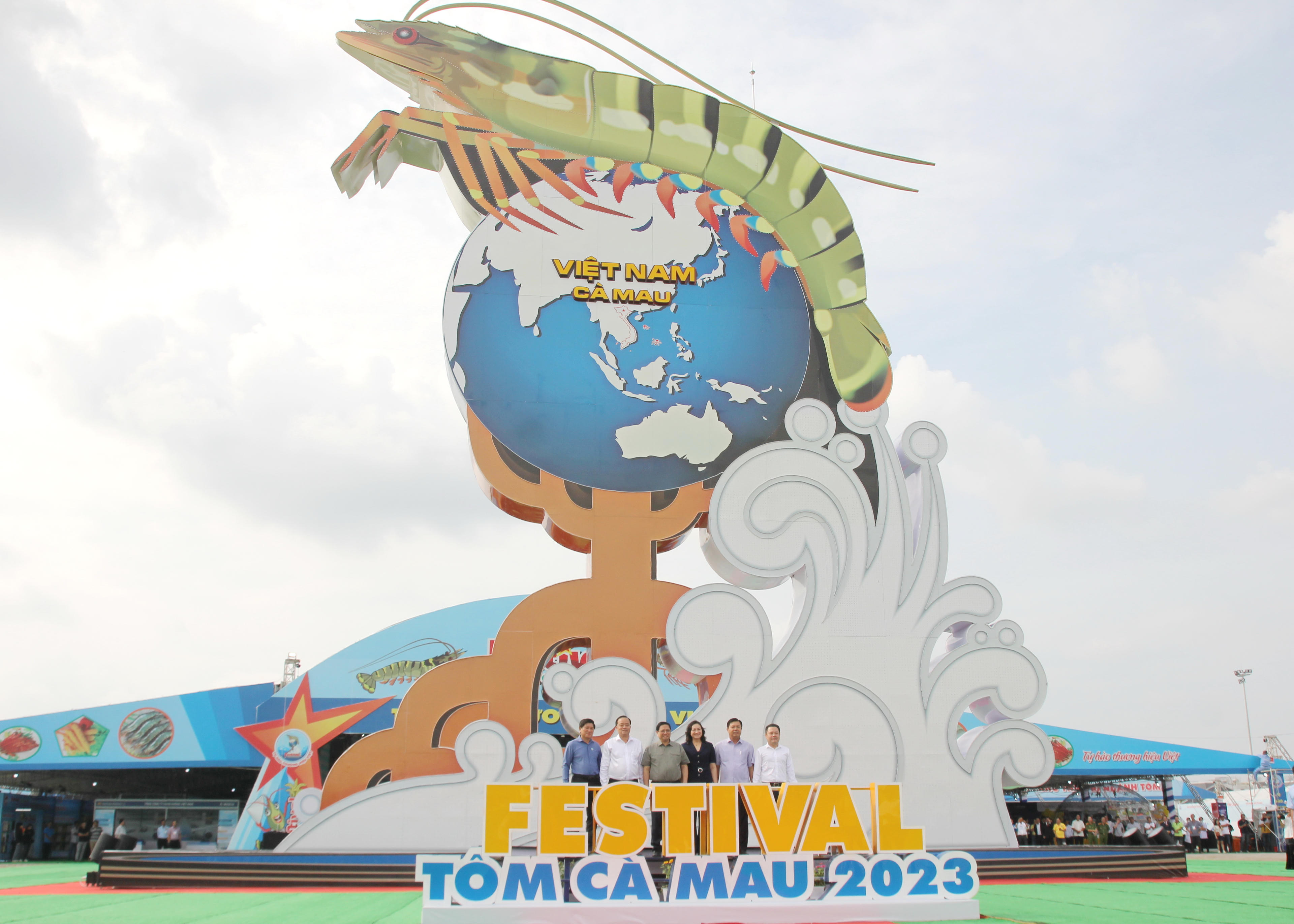 Thủ tướng Chính phủ Phạm Minh Chính cùng lãnh đạo tỉnh Cà Mau, Trung ương chụp ảnh lưu niệm với biểu tượng Festival Tôm Cà Mau 2023. |