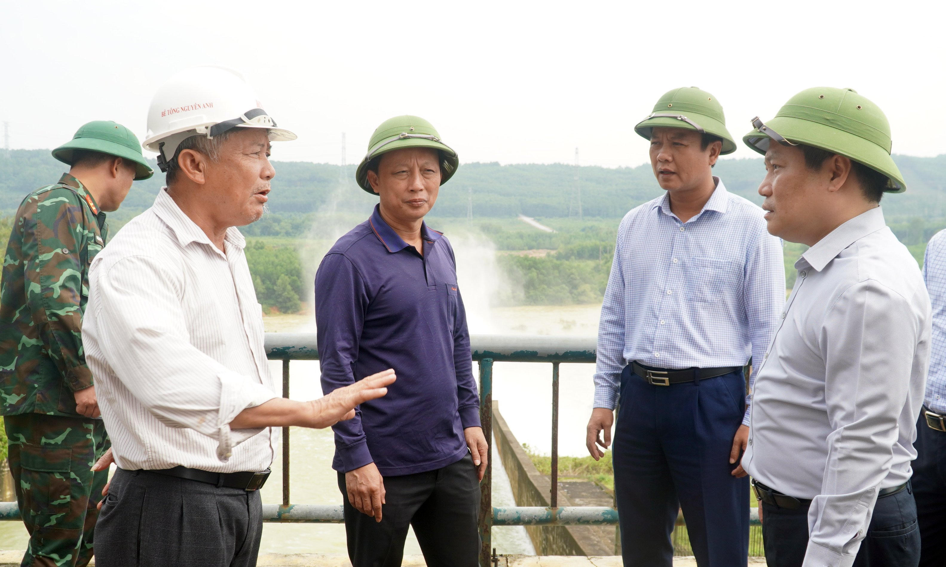 Ông Vũ Đại Thắng, Bí thư Tỉnh ủy Quảng Bình (ngoài cùng bên phải) kiểm tra công tác vận hành điều tiết nước hồ chứa Rào Đá sáng ngày 16/10. |