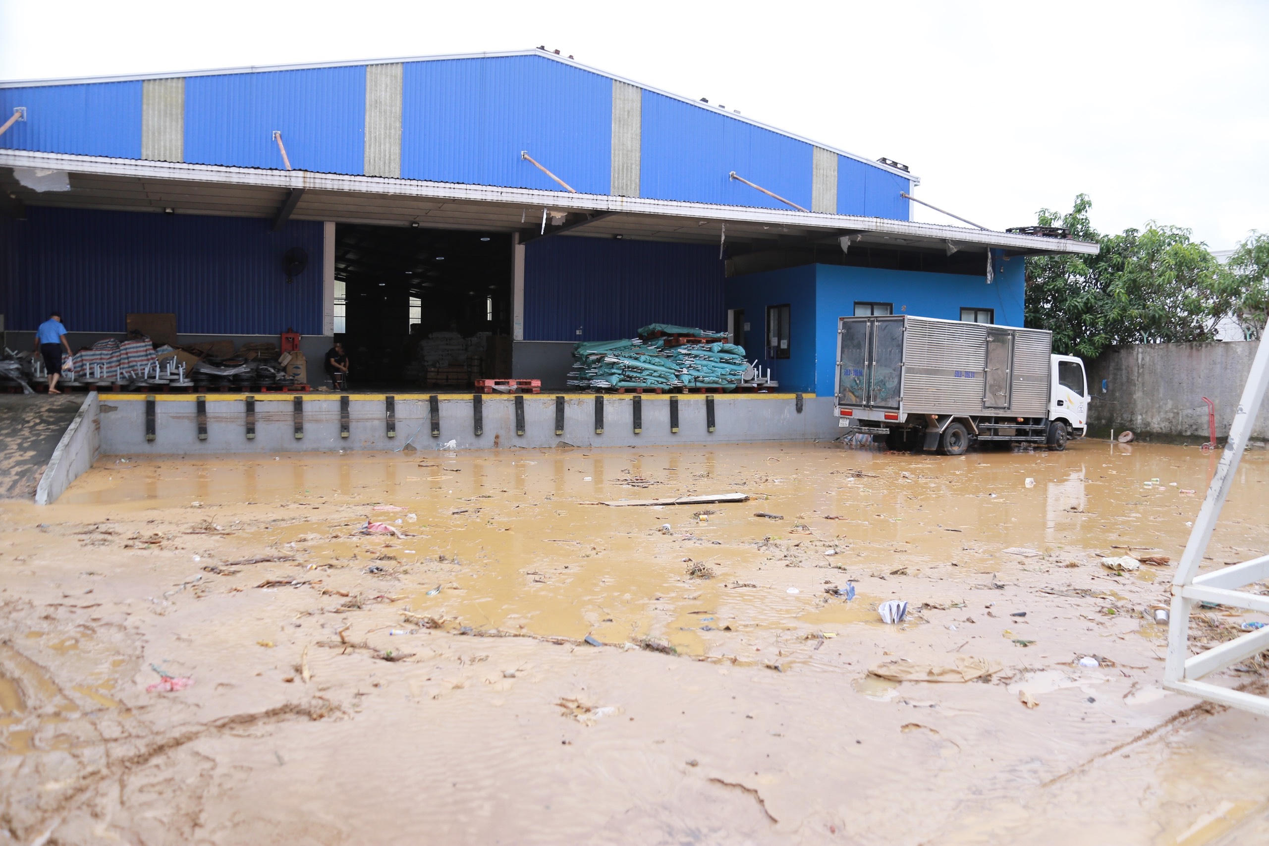 Nước rút để lại lớp bùn dày kèm nhiều rác thải trong công ty ở KCN. |