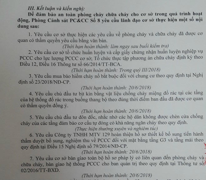 Cũng tại biên bản trên, đại diện chủ đầu tư cho biết, hệ thống PCCC đang được trang bị trong tòa nhà cơ bản đảm bảo chất lượng. Tuy nhiên, hệ thống báo cháy đôi lúc còn bị lỗi. Hệ thống PCCC nói chung cần được bảo dưỡng thường xuyên, định kỳ. Bên cạnh đó, chủ đầu tư cũng nhận thiếu xót về việc chưa được nghiệm thu công tác PCCC tại các tầng G1, G2, G3 và tầng mái.