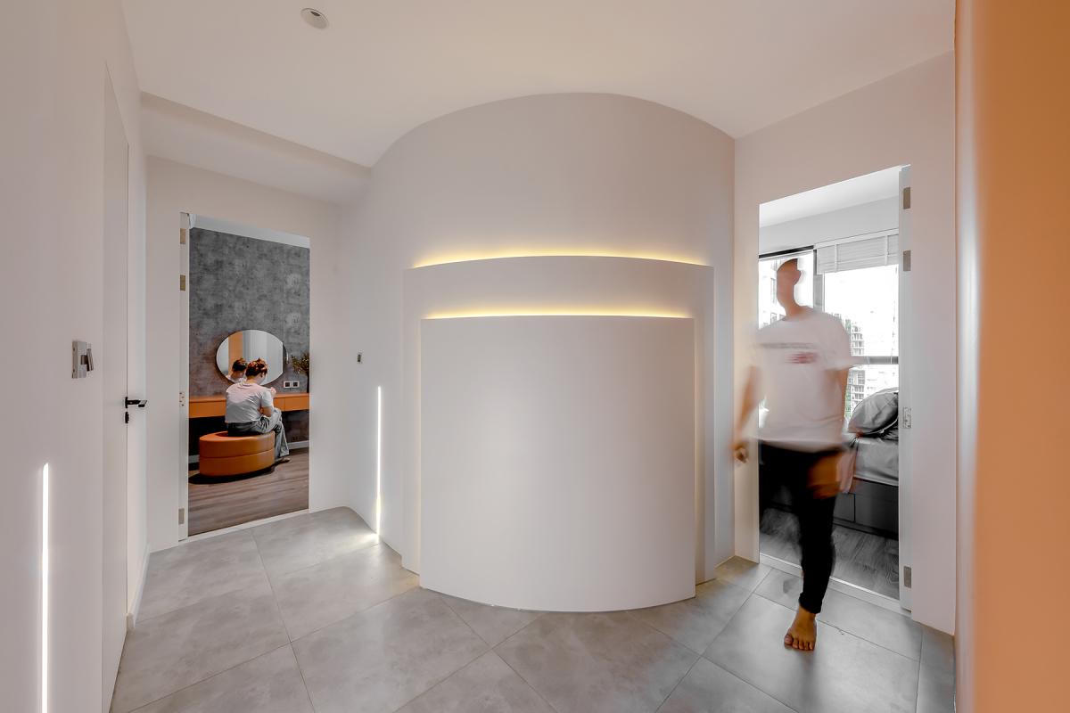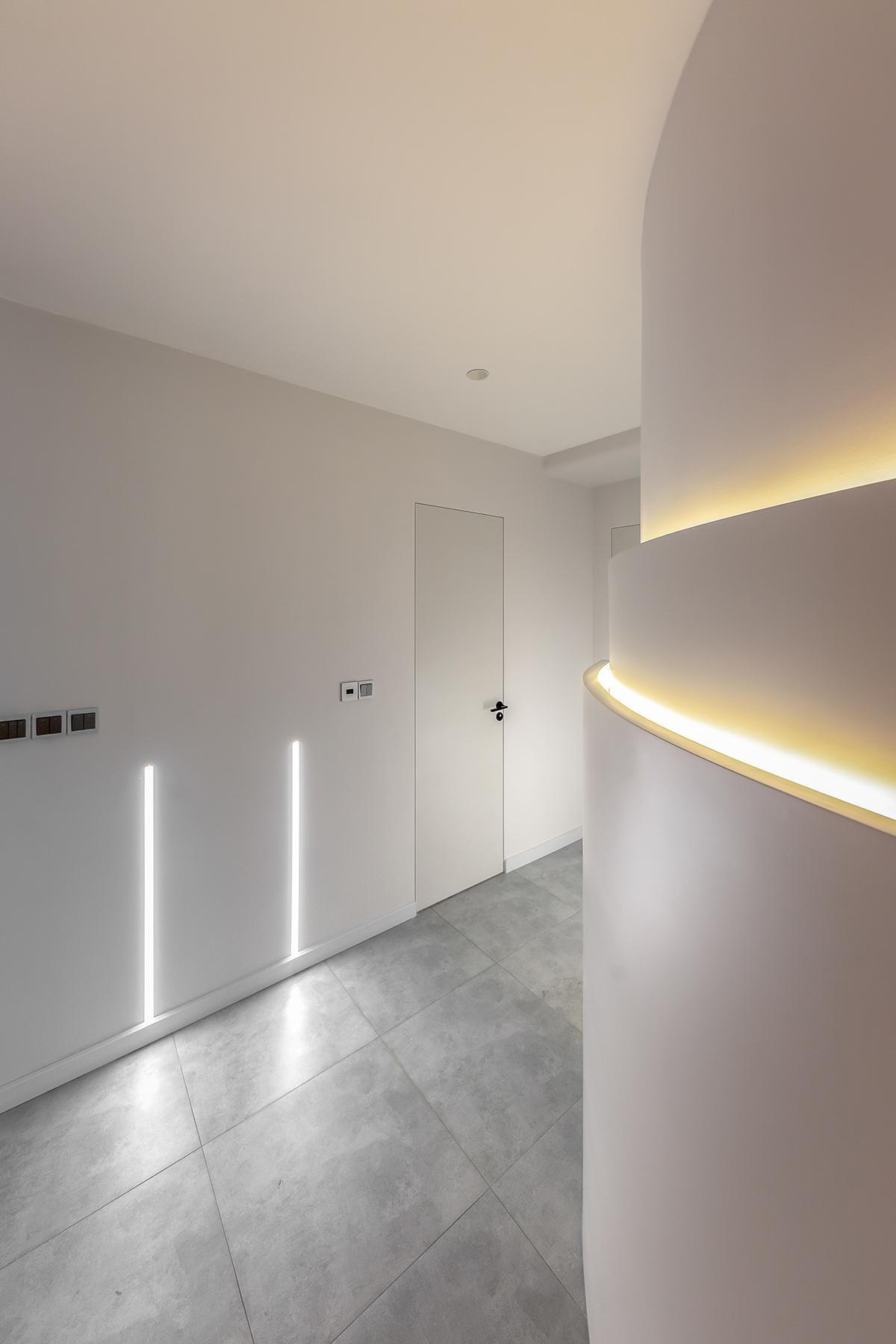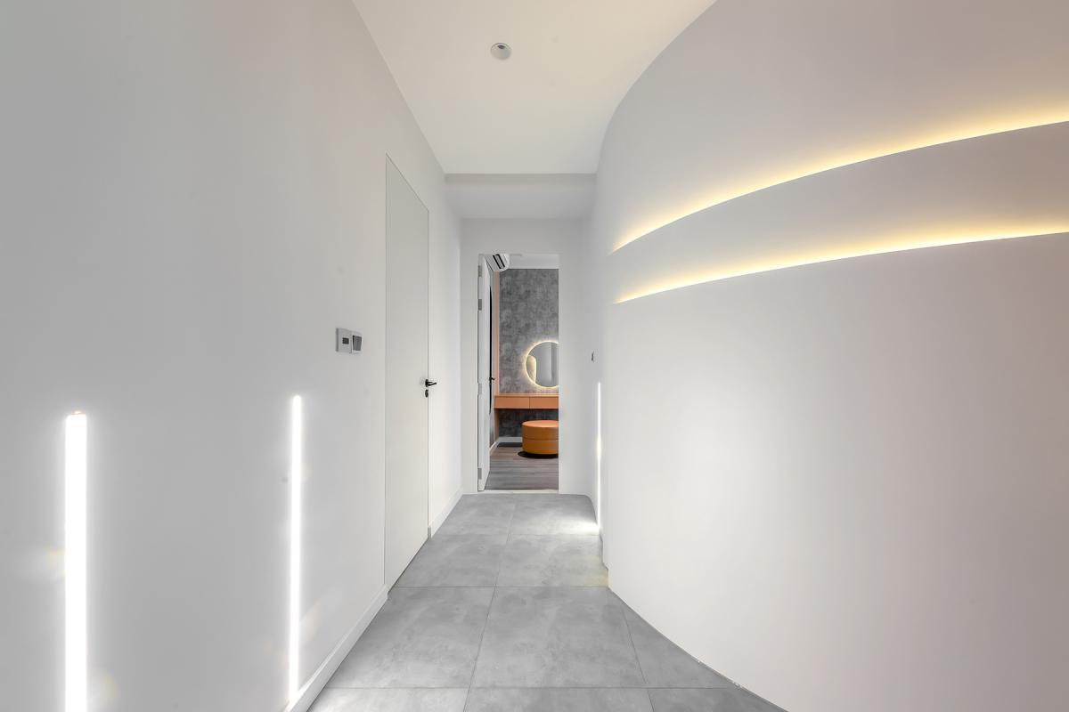Kiến trúc sư dỡ bỏ bức tường cũ vuông vức, thay thế bằng bức tường cong cùng dàn đèn led màu vàng nhạt khiến không gian hành lang sáng hơn, trở thành điểm nhấn mỗi khi đêm về.