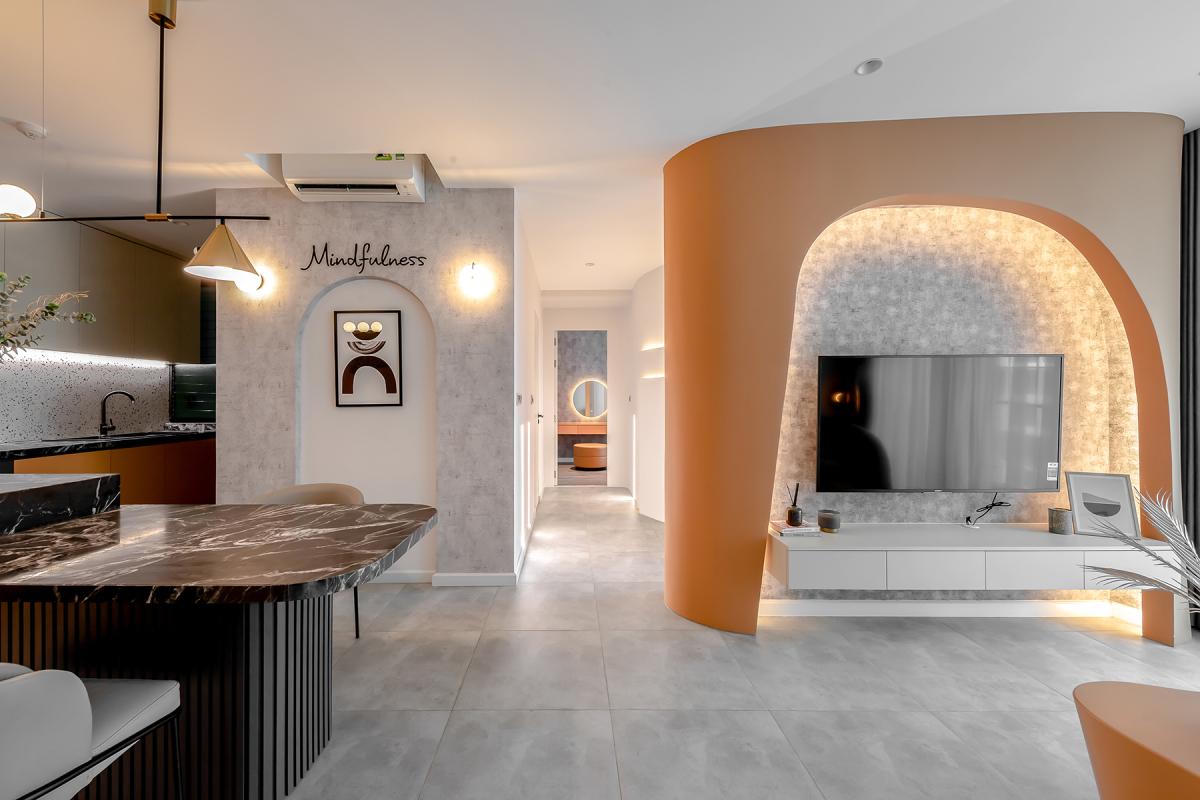Bởi diện tích căn hộ không lớn nên kiến trúc sư chú trọng tới tính xuyên suốt không gian, hạn chế sử dụng tường phân chia các phòng chức năng.