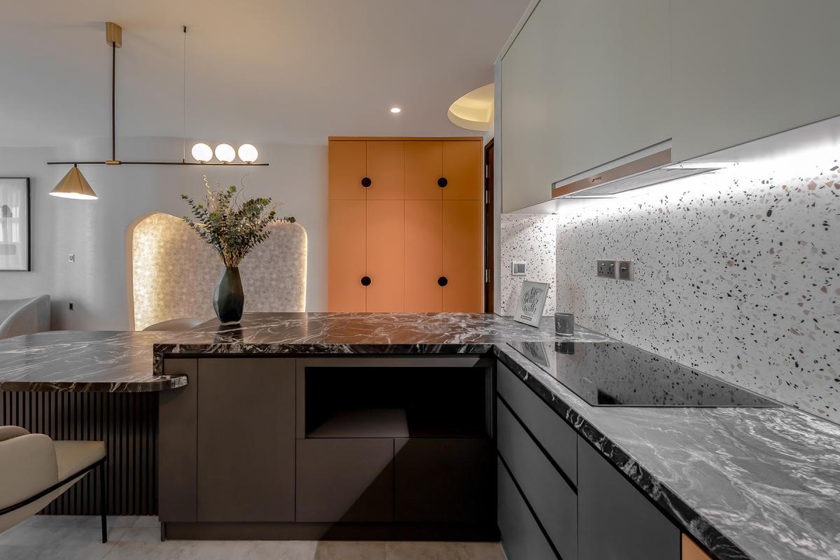 Không gian bếp được thiết kế với tông màu tối cùng điểm nhấn nhắc lại của màu cam. Nội thất bếp màu đen phù hợp cho căn hộ có tường màu sáng, đồng thời khiến nơi này luôn dịu mát, dễ vệ sinh và sạch sẽ.