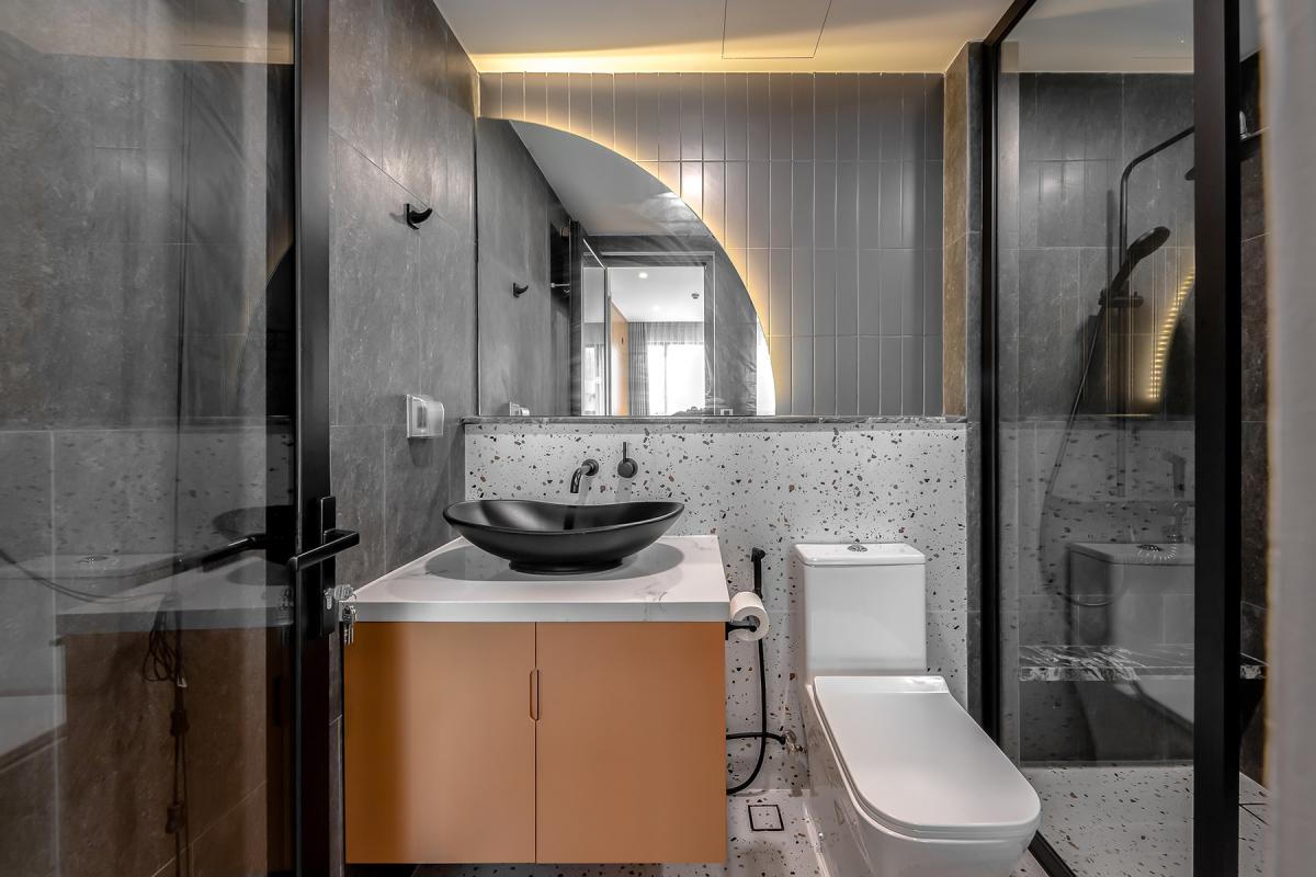 Nhà vệ sinh của căn hộ sử dụng những món đồ thiết kế đơn giản, ít chi tiết và đơn sắc.