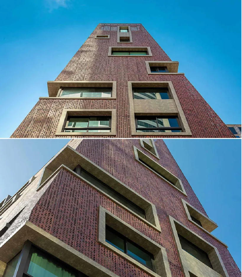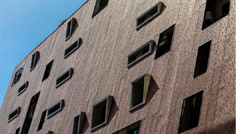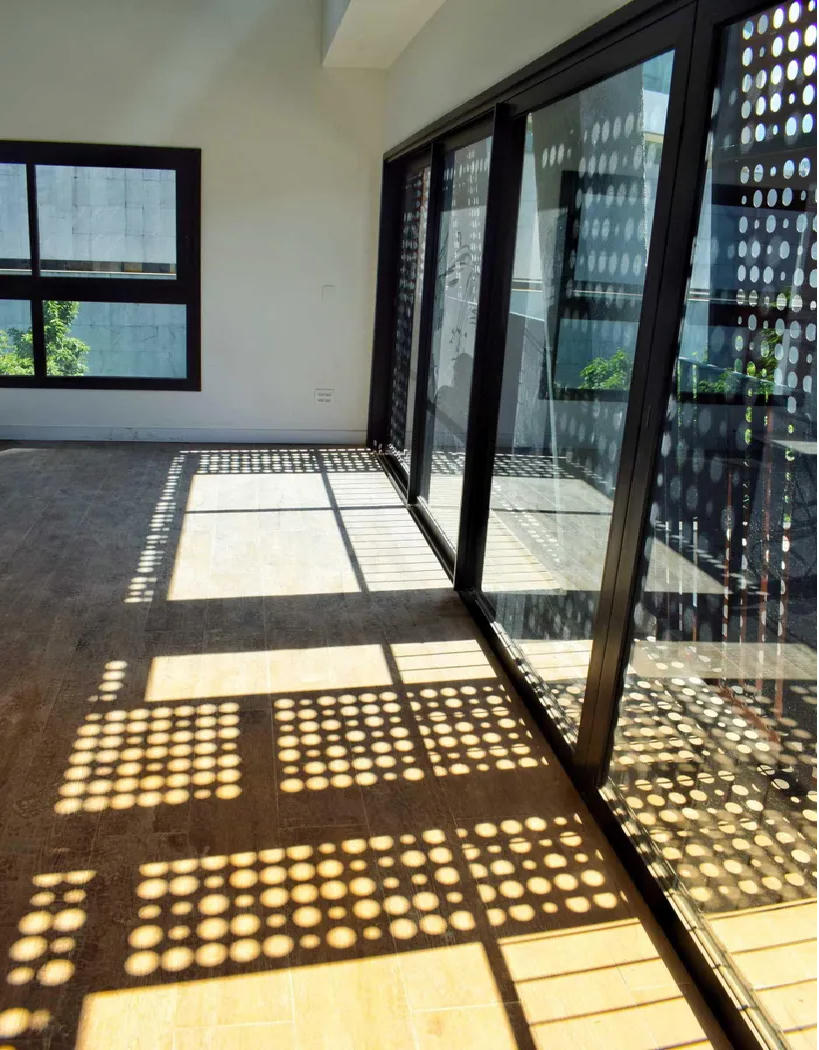 Lớp kim loại này che mặt tiền toà nhà khỏi ánh nắng trực tiếp, cung cấp đủ ánh sáng tự nhiên cho các căn hộ, cho phép người trong nhà quan sát được khu vực xung quanh nhưng vẫn đảm bảo sự riêng tư cho chủ nhân.