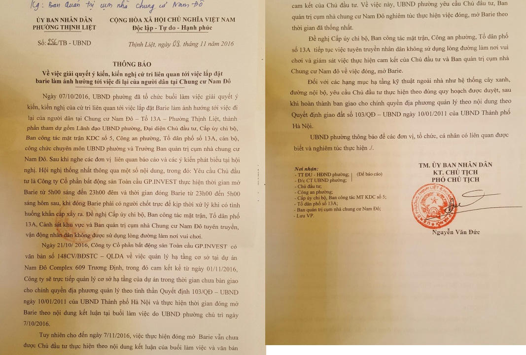 Liên quan đến việc UBND phường Thịnh Liệt ra văn bản mở barie cho phép phương tiện giao thông đi lại qua đường nội bộ của chung cư Nam Đô, báo PLVN đã liên hệ làm việc với UBND phường Thịnh Liệt. Tuy nhiên, tới nay vẫn chưa có bất cứ thông tin phản hồi nào từ phía cơ quan này.