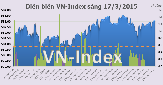 Trở lại phiên giao dịch sáng nay, VN-Index tăng 2,3 điểm (tương đương tăng 0,4 %), lên mức 583,1 điểm. Tổng khối lượng giao dịch toàn sàn đạt hơn 53 triệu đơn vị, tương đương giá trị giao dịch là 893,57 tỷ đồng.