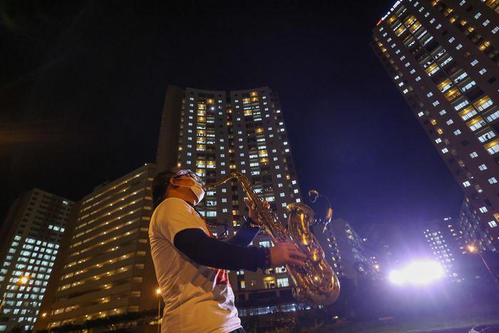Nghệ sĩ sacxophone Trần Mạnh Tuấn biểu diễn phục vụ các y bác sĩ và bệnh nhân tại tâm dịch Covid-19 TP Hồ Chí Minh. |
