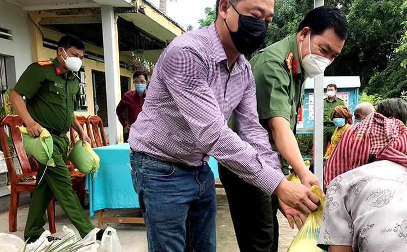Đại tá Lâm Thành Sol, Phó Giám đốc Công an tỉnh cùng Mạnh Thường Quân trao nhu yếu phẩm cho đồng bào khó khăn |