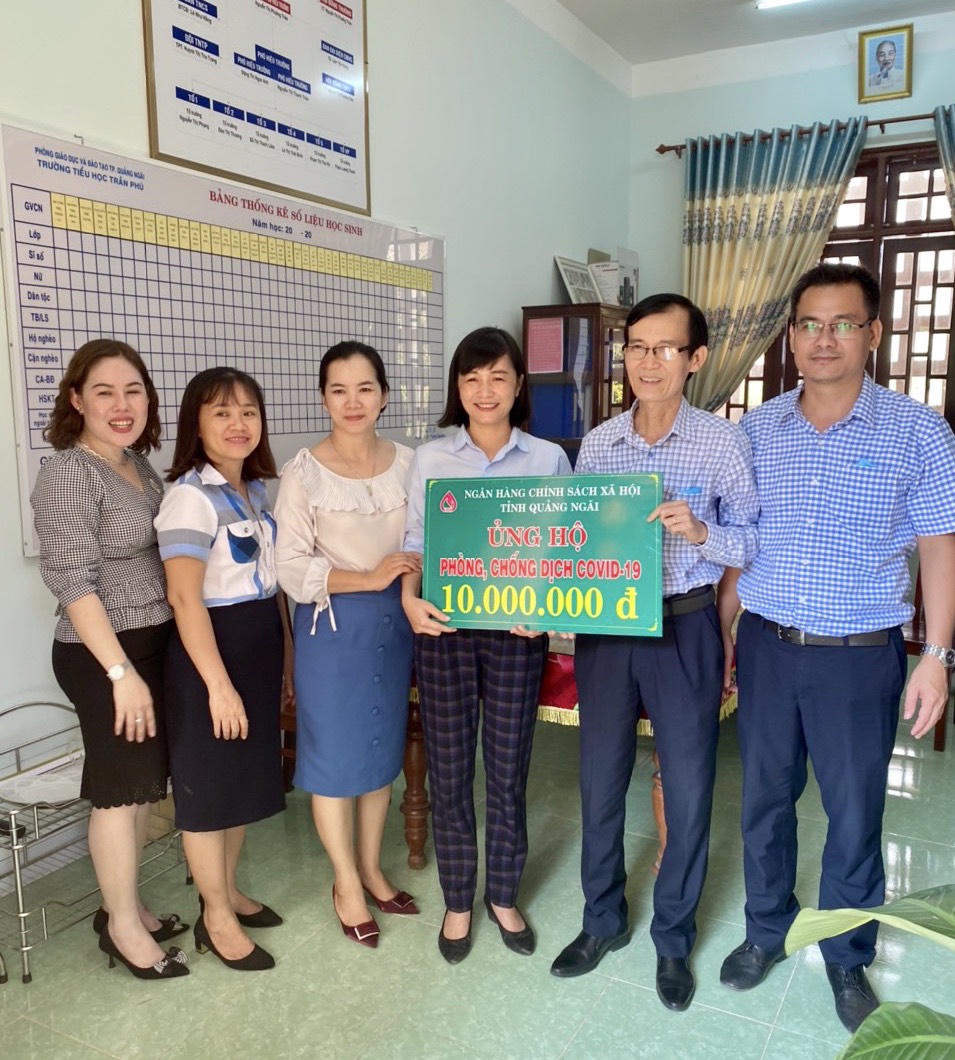 Cụ thể, NHCSXH Quảng Ngãi đã trao ủng hộ kinh phí phòng chống dịch Covid-19 cho các Trường Tiểu học Nguyễn Nghiêm, Trần Phú, Nghĩa Lộ, Trương Quang Trọng và Trường THCS xã Tịnh Long, mỗi trường ủng hộ 10.000.000 đồng.
