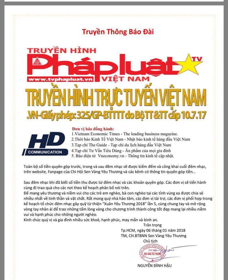 (PLO) - Vừa qua trên một số trang mạng, trong đó có Fanpage của "Chi hội Sen vàng yêu thương" có đăng thông cáo về Chương trình đêm nhạc "Chào Xuân yêu thương 2018", do Chi hội sen vàng, Truyền hình trực tuyến Việt Nam và một số báo, đài đồng hành. Thông cáo do ông Nguyễn Đình Hậu (Chủ tịch Hội Sen vàng yêu thương) ký tên, đóng dấu có gắn Logo của Truyền hình Pháp Luật Việt Nam để kêu gọi từ thiện cho chương trình.