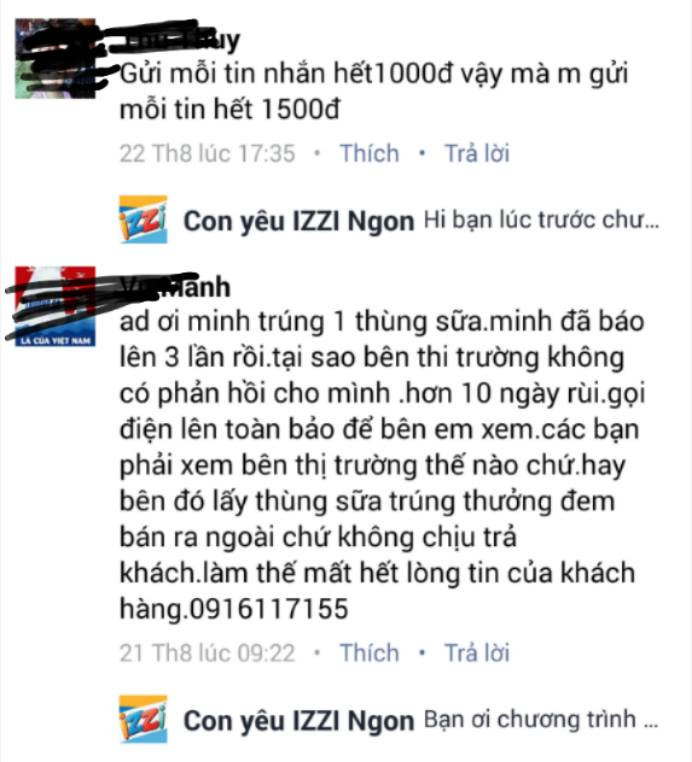Không chỉ dừng lại ở đó, sau khi kiểm tra tài khoản thuê bao với nhà mạng Vinaphone thì khách hàng nhận thấy số tiền bị trừ trong mỗi tin nhắn là 1.500đồng chứ không phải là 1.000 đồng như thông báo của thương hiệu sữa IZZI thể hiện trên voucher khuyến mãi cũng như nội dung đăng tải trên website. Đây cùng là thắc mắc của khá nhiều khách hàng để lại bình luận (Comment) trên fanpage chính thức của sữa Izzi tại địa chỉ conyeuizzingon. Và cũng tại đây, đại diện của công ty có đưa ra lời giải thích riêng với một tài khoản facebook rằng “do nhà mạng có chính sách thay đổi giá”.