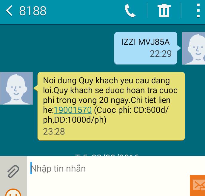 (PLO) - Sau khi gửi mã thẻ khuyến mại tới tổng đài 8188 để tham gia chương trình “Vui hè cùng Izzi – Trúng thưởng ngay hay đi du lịch”, hệ thống tự động gửi tin nhắn báo lỗi và thuê bao sẽ được hoàn trả cước phí trong vòng 20 ngày. Tuy nhiên, sau khi tìm hiểu, khách hàng nhận thấy thuê bao bị trừ 1.500đ/tin nhắn tiền cước dịch vụ chứ không phải 1.000đ/tin nhắn như IZZI quảng cáo…