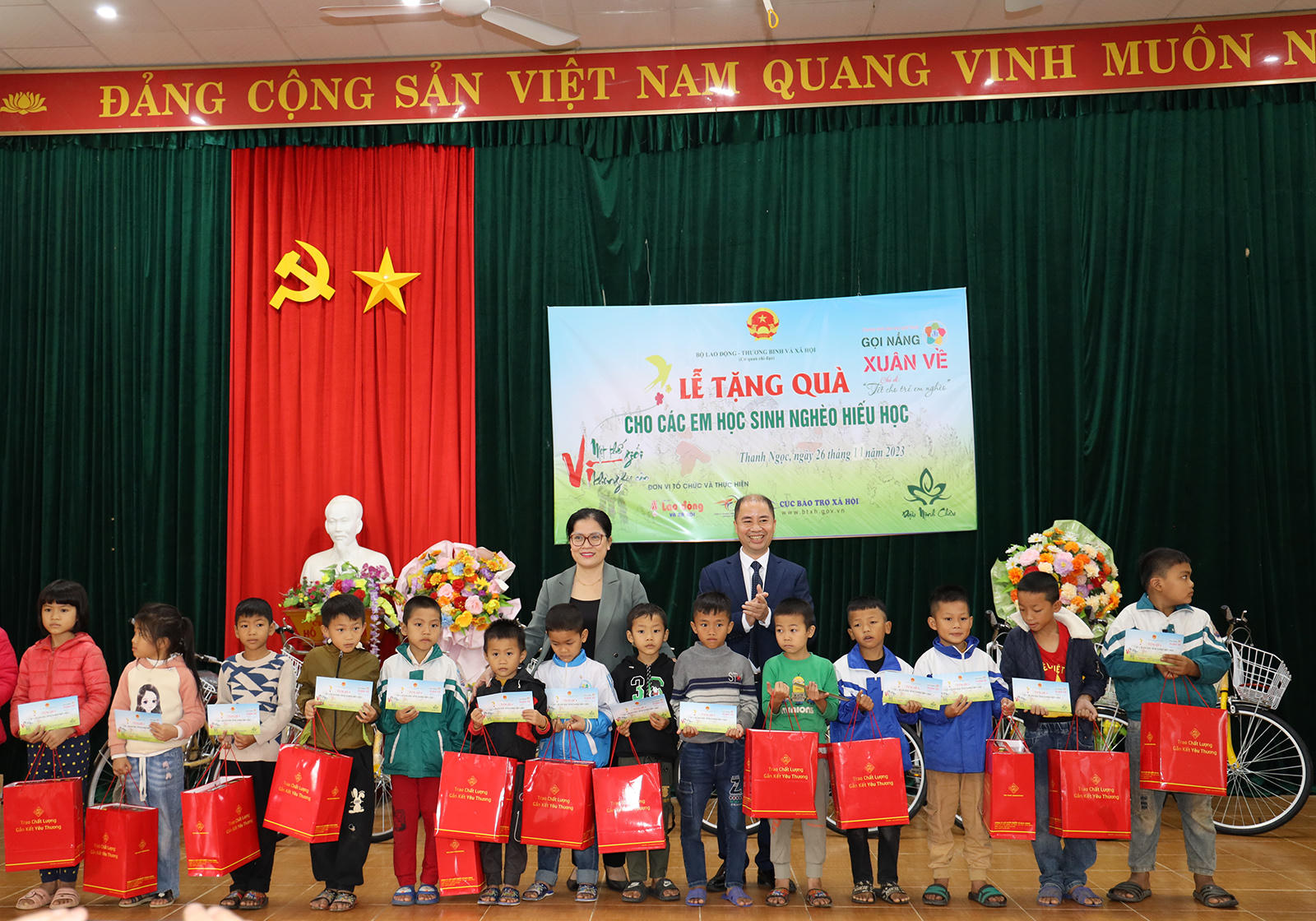 (PLVN) - Ngày 26/11/2023, được sự chỉ đạo của Bộ Lao động – Thương binh và Xã hội, Ban Tổ chức Chương trình giao lưu nghệ thuật “Gọi nắng xuân về” năm 2023 với chủ đề “Tết cho trẻ em nghèo” do Tạp chí Lao động và Xã hội phối hợp với Công ty Cổ phần Phát triển Truyền thông Văn hóa Việt Nam và các đơn vị liên quan tổ chức đã có buổi trao tặng quà cho các em học sinh có hoàn cảnh khó khăn tại xã Thanh Ngọc, huyện Thanh Chương - tỉnh Nghệ An.