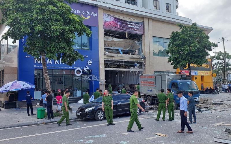 Tại hiện trường, trong cửa hàng có một số bình gas. Các vật liệu kim loại, gỗ, nhựa... bị gãy và biến dạng, vương vãi ra vùng lân cận rộng cả trăm mét vuông. Kính của nhiều cửa hàng xung quanh cũng bị nứt, vỡ.