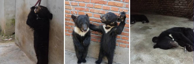 Mệt cũng không thể nghỉ, vì nếu hạ chân xuống, chúng có thể ngạt thở mà chết. Cứ như thế đến bao giờ chúng chịu và quen đứng bằng hai chân thì thôi. Hay trò gấu trồng chuối, để luyện tập gấu con bị buộc phải trồng chuối trên một thanh sắt, cứ mỗi lần muốn buông tay nghỉ, gấu phải nhận một cú quất roi đau điếng...