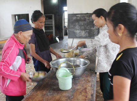 Hằng ngày, khoảng 10h30 – 11h trưa, các cụ ông, cụ bà thuộc đối tượng neo đơn có sức khỏe tập trung tại nhà bếp nhận khẩu phần ăn cho mình. Một số các cụ không đứng dậy được phải mang cơm tận phòng và đút cơm cho các cụ.