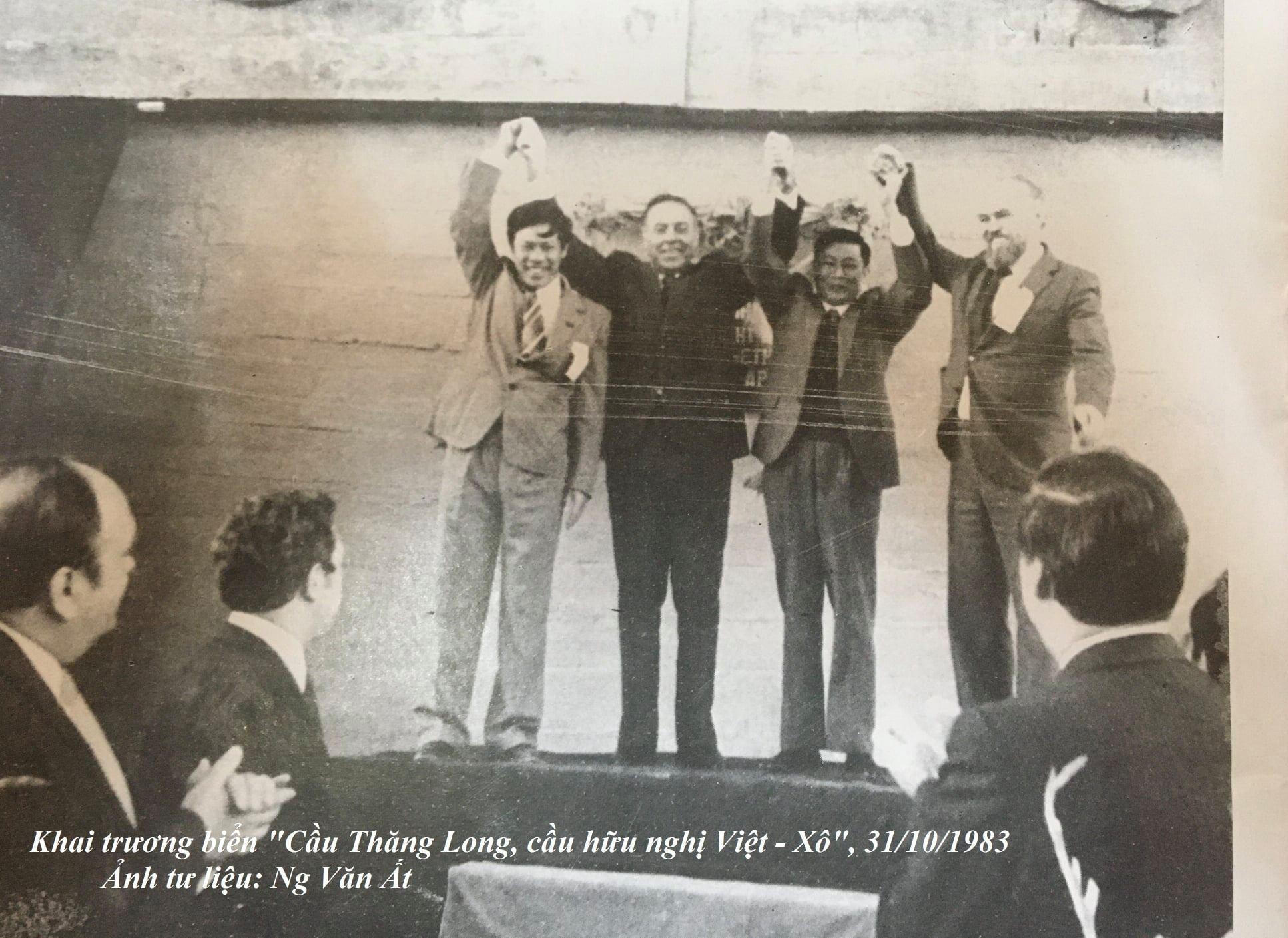 Ông Aliev, ông Đồng Sỹ Nguyên cùng Trưởng đoàn chuyên gia Liên Xô và TGĐ cầu Thăng Long khai trương tấm biển đồng “Cầu Thăng Long, cầu hữu nghị Việt – Xô”. |