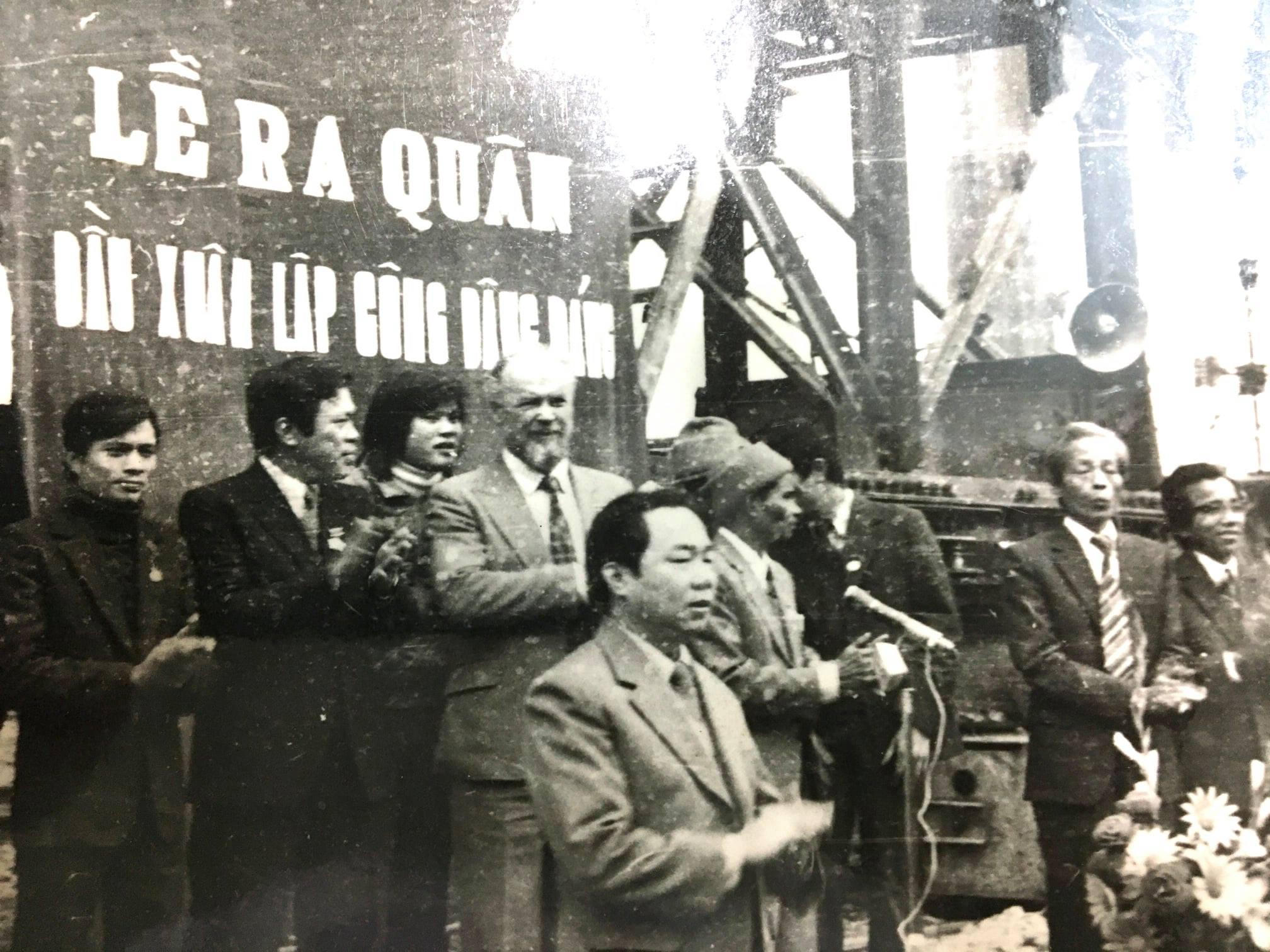 Ông Vũ Mão lên công trình Thăng Long phát động thanh niên thi đua (tác giả tóc dài đứng thứ ba ở hàng thứ 2 tính từ trái sang). |