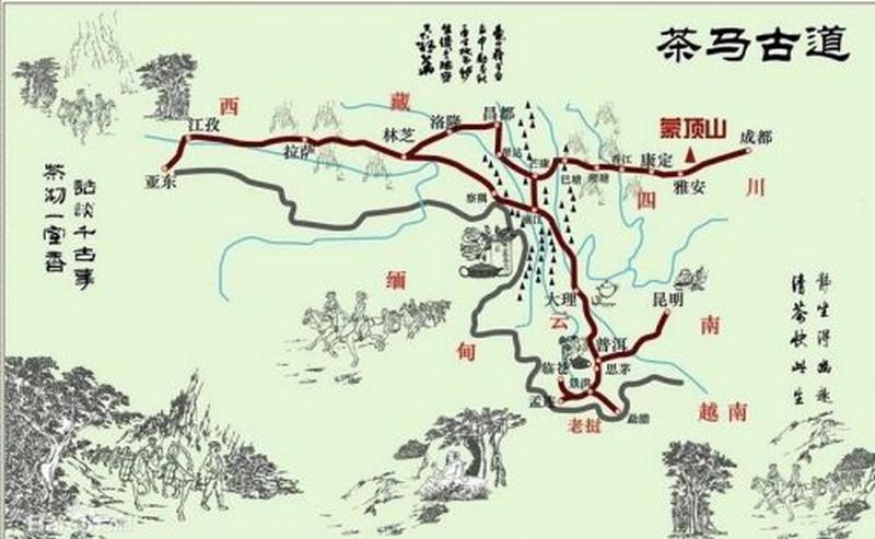 | Trà Mã cổ đạo nối các tỉnh Vân Nam, Tứ Xuyên với Tây Tạng (điểm cuối bên trái trên bản đồ). |