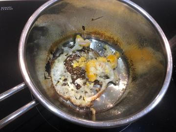 Có sẵn dụng cụ nấu ăn nhưng Thái Sơn (TP Thủ Đức) thậm chí không phân biệt được các loại chảo. Món trứng ốp la cháy khét khi rán bằng nồi.