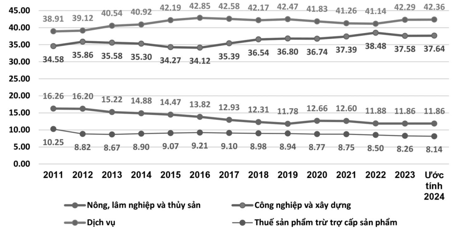 Xu hướng chuyển dịch cơ cấu kinh tế Việt Nam giai đoạn 2011 - 2024 (%). |