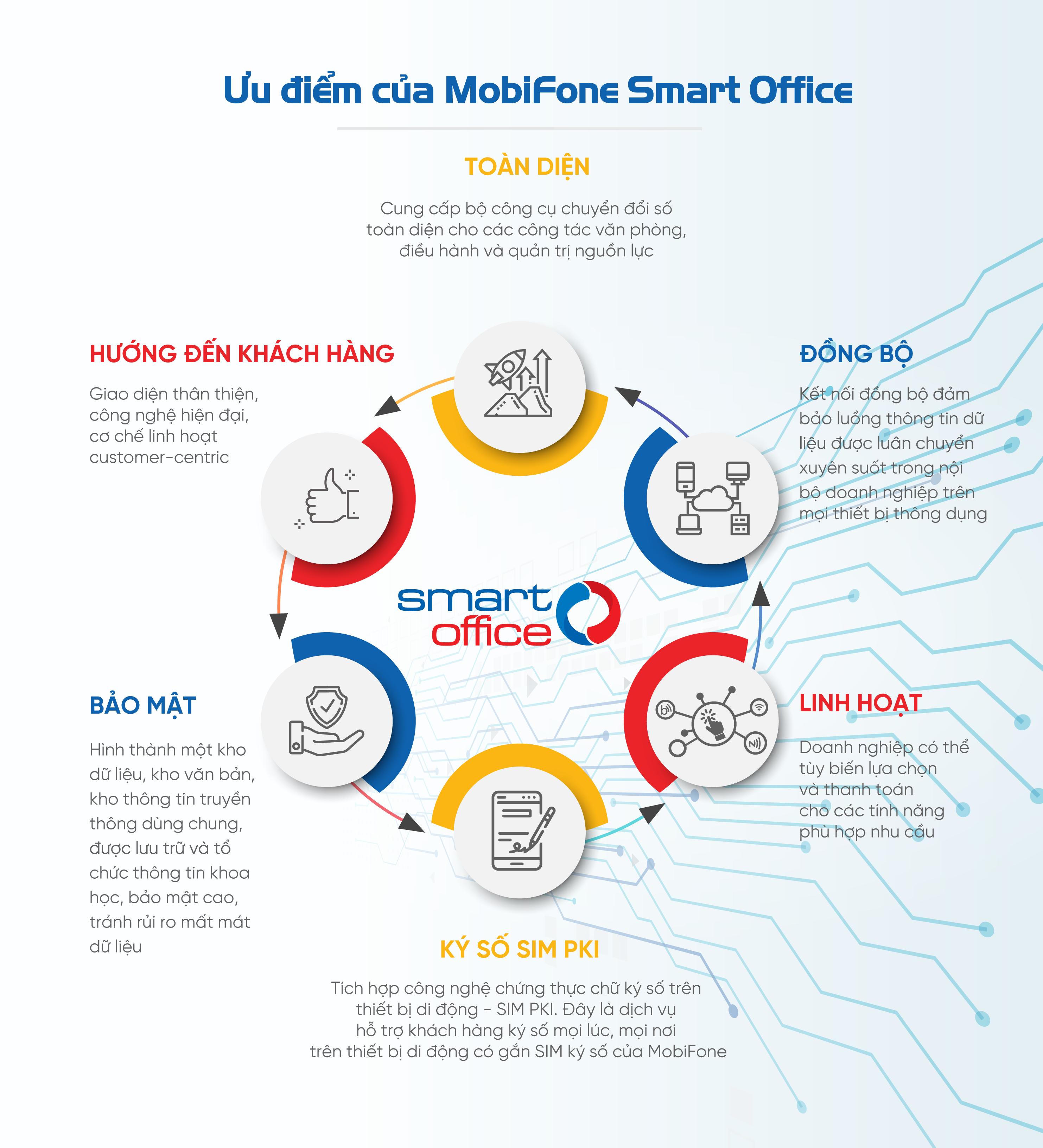 MobiFone Smart Office - được phát triển bởi MobiFone, là bộ sản phẩm cung cấp một nền tảng quản trị hợp nhất giúp các DN, tổ chức và cơ quan chính phủ chuyển đổi số một cách toàn diện.