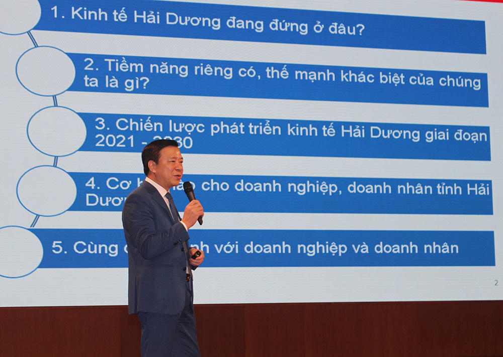 Bí thư Tỉnh ủy đã giới thiệu với các doanh nghiệp về Chiến lược phát triển kinh tế của tỉnh Hải Dương trong 10 năm tới, với mục tiêu phấn đấu đến năm 2025 là tỉnh công nghiệp theo hướng hiện đại, tạo tiền đề đến năm 2030 là tỉnh công nghiệp hiện đại, tạo nền tảng sớm trở thành thành phố trực thuộc trung ương. Quan điểm phát triển xuyên suốt, bao trùm là "Tăng trưởng xanh và đổi mới sáng tạo để phát triển bứt phá, bền vững, nâng tầm văn hóa Hải Dương". Chiến lược phát triển kinh tế của tỉnh tới năm 2030 gồm: Bốn trụ cột - Ba nền tảng - Một trung tâm - Ba đô thị động lực - Ba trục phát triển.