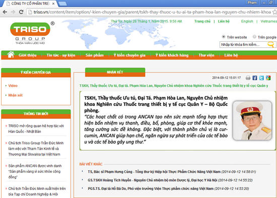 Như báo Pháp luật Việt Nam đã đưa tin về việc giới thiệu, quảng cáo sản phẩm TPCN Ancan của Công ty Cổ phẩn Triệu Sơn (TRISO). Dù theo quy định, một trong những hành vi trong hoạt động quảng cáo thực phẩm trong Thông tư 08/2013/TT-BYT là cấm "Sử dụng hình ảnh, uy tín, thư tín của các đơn vị y tế, nhân viên y tế, thư cảm ơn của bệnh nhân để quảng cáo thực phẩm" trên website của mình, Công ty TRISO vẫn cho đăng tải hình ảnh, ý kiến của một số GS, TS, bác sỹ "đính kèm" như một cách giới thiệu, quảng cáo sản phẩm Ancan trong mục "Ý kiến chuyên gia".