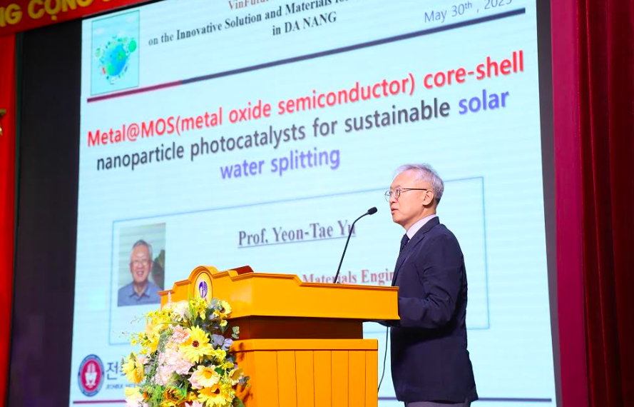 GS. Yeon-Tae Yu (Đại học Quốc gia Jeonbuk, Hàn Quốc) đã giới thiệu những bước tiến trong nghiên cứu cấu trúc nano lõi – vỏ Metal@MOS, một chất xúc tác tiềm năng ứng dụng trong quá trình tách nước bằng năng lượng mặt trời. Ông chia sẻ: “Cấu trúc nano lõi – vỏ kim loại MOS giải quyết căn bản hai thách thức then chốt trong quang xúc tác: nâng cao hiệu suất phản ứng nhờ chất xúc tác kim loại quý, đồng thời đảm bảo tính ổn định lâu dài bằng cách bảo vệ các chất xúc tác khỏi bị suy thoái.”
