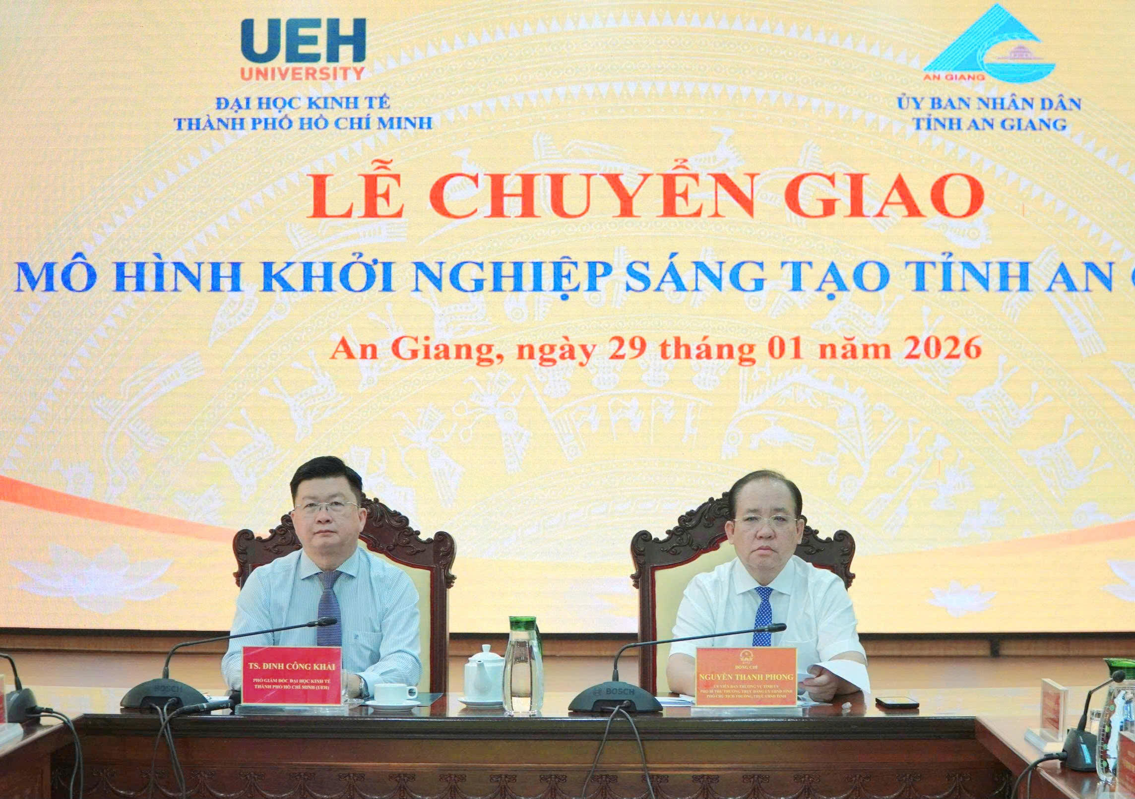 Tại lễ chuyển giao, lãnh đạo Sở Khoa học và Công nghệ và lãnh đạo Viện Đổi mới sáng tạo (Đại học Kinh tế Thành phố Hồ Chí Minh) ký kết biên bản chuyển giao mô hình khởi nghiệp sáng tạo tỉnh An Giang; đồng thời bấm nút ra mắt Nền tảng trực tuyến hỗ trợ ươm tạo khởi nghiệp sáng tạo tỉnh An Giang.