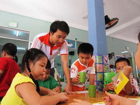 Một ngày làm việc của thầy giáo đặc biệt Nguyễn Hữu Toàn bắt đầu từ 6 giờ sáng. Sau đoạn đường từ nhà riêng ở quận Phú Nhuận đến trường, là công việc đón trẻ vào lớp, kiểm tra vệ sinh. Bao giờ cũng thế, trước giờ tập thể dục sáng, thầy hướng dẫn cho các em xếp đặt giày dép, ba lô quần áo đúng vị trí qui định. Thầy giáo trẻ ân cần: “Đến giờ thể dục rồi, các con ra xếp hàng nha”. Khi các em xếp hàng ngay ngắn, thầy Toàn không quên nói lời “thầy chào các con”. Ngay lập tức hơn 30 đứa trẻ khoanh tay trước ngực đồng thanh hô “chúng con chào thầy ạ”.