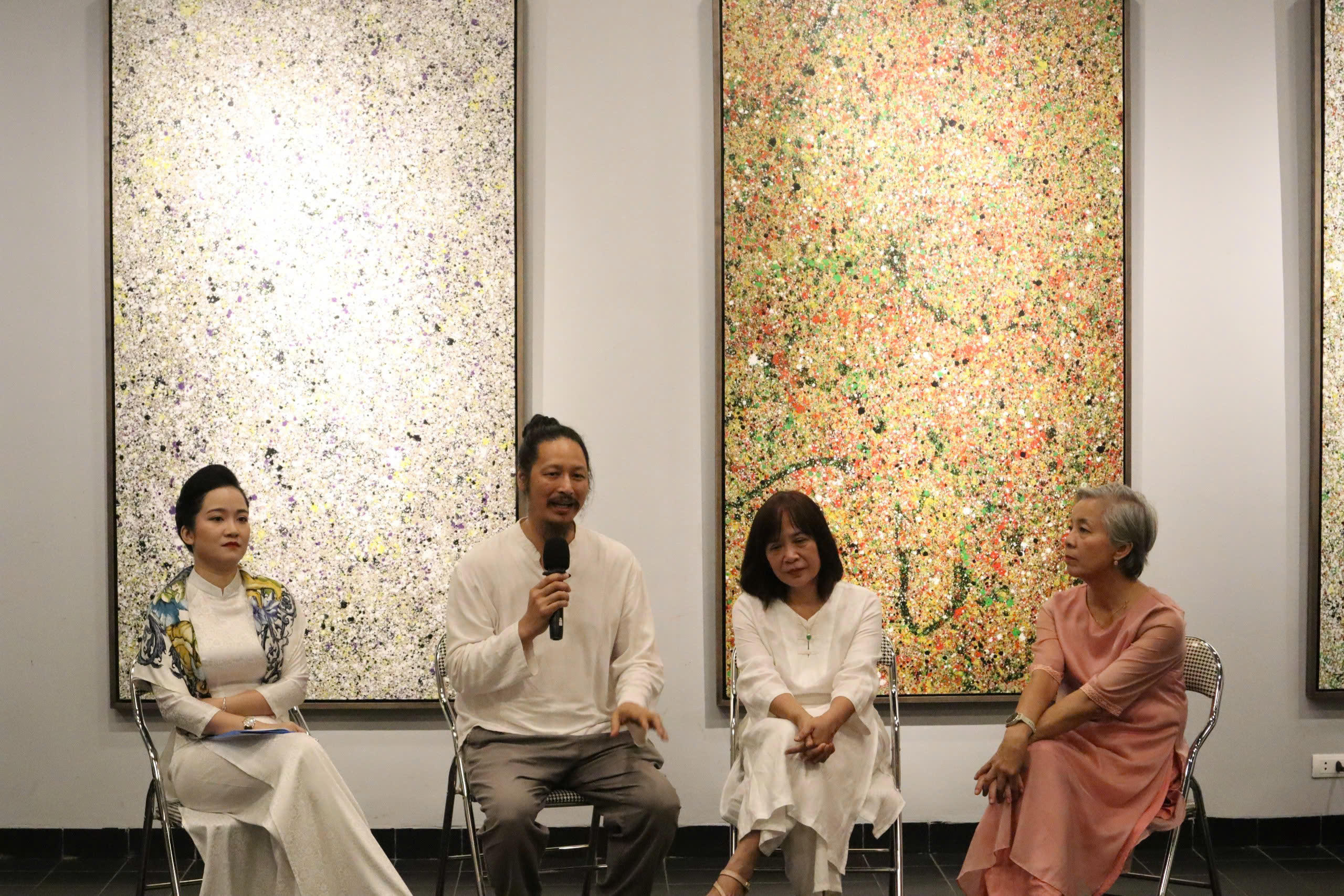 Họa sĩ Thái Tĩnh và thiền nhân Đinh Hoàng Anh (2 người giữa) thời gian qua đã có nhiều cuộc thảo luận về chủ đề phụ nữ, bạo lực giới. |