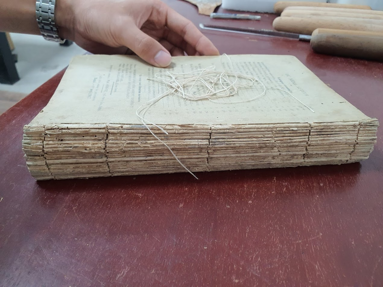 Vì để sửa những hư hại như vậy vượt quá khả năng nên mình quyết định gửi cuốn sách tới Hán Nôm Đường, vốn rất chuyên nghiệp trong chuyện này để các trang giấy được vá lại trước khi khâu. Cuốn sách về với tay mình khoảng 2 tuần sau đó. Tuy nhiên, mất không lâu để mình nhận ra một vấn đề vì số các trang sách được vá rất là nhiều nên giờ gáy sách bị phồng lên một khoảng thấy rõ. Điều này sẽ gây ảnh hưởng lớn tới công đoạn khâu cuốn sách... Mình quyết định chọn loại chỉ 30/3, dày 0,35mm, khâu với 3 đai ruy băng linen. Tờ gác mình không làm theo kiểu khâu cùng với lõi sách như thường lệ (gọi là made-endpapers), mà dùng khớp da thay cho nó. Kỹ thuật này mình tham khảo được từ bác Peter Caine, một thợ đóng sách sống tại Pháp. Bác rất nhiệt tình khi vẽ cả hình minh họa cho mình để dễ hiểu hơn. Bác nói đây là kiểu mà người Pháp hay sử dụng...
