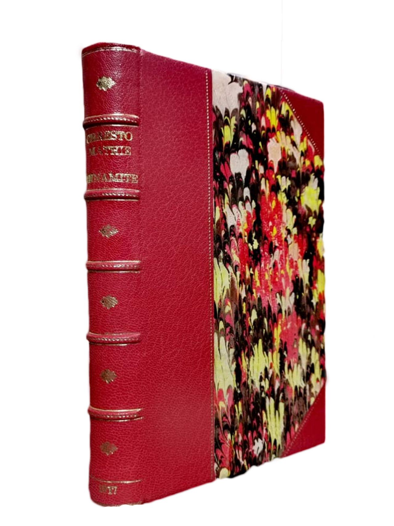Sau công đoạn này là công đoạn bọc sách. Mình sử dụng tấm da dê Alran màu đỏ vermilion có vân khá mạnh. Giấy thủy ấn mình tự làm với tông màu nóng để tăng sự hòa hợp với da bọc. Khớp da hoạt động một cách hoàn hảo. Từ trước đến nay mình chưa làm được một cuốn sách có bìa mở được tốt như vậy, 180 độ và có khi hơn thế nữa! Các màu khi phối với nhau cũng khiến mình rất ưng ý. Công đoạn cuối cùng là trang trí. Mình mạ nhũ vàng ở gáy với con lăn cổ của Pháp và một dấu trung tâm (center-piece) cổ từ Anh. Trên bìa cũng chạy đường chấm dọc theo mép của các phần bọc khác nhau...”.