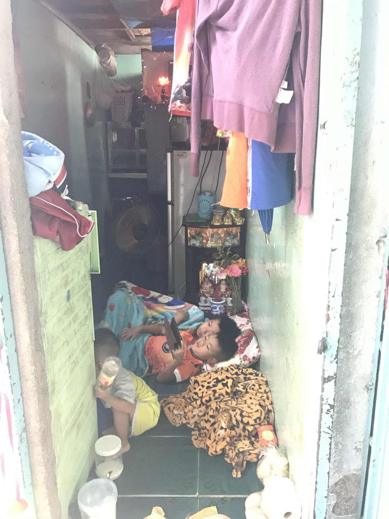 Nhà 2 mẹ con, tầng 1 chỉ đủ làm nhà vệ sinh, đặt chiếc ghế dài làm giường, thêm tủ lạnh, còn con cái phải ở trên gác gỗ. Cạnh đó vài căn, cảnh chật chội còn khủng khiếp hơn, trong căn nhà 7,5m2, 16 người lớn bé trong gia đình chị Huỳnh Thị Thanh (46 tuổi, 245/51, Nguyễn Trãi) chen chúc nhau, tôi đứng ngoài hẻm nhìn vào thôi cũng thấy khó thở.