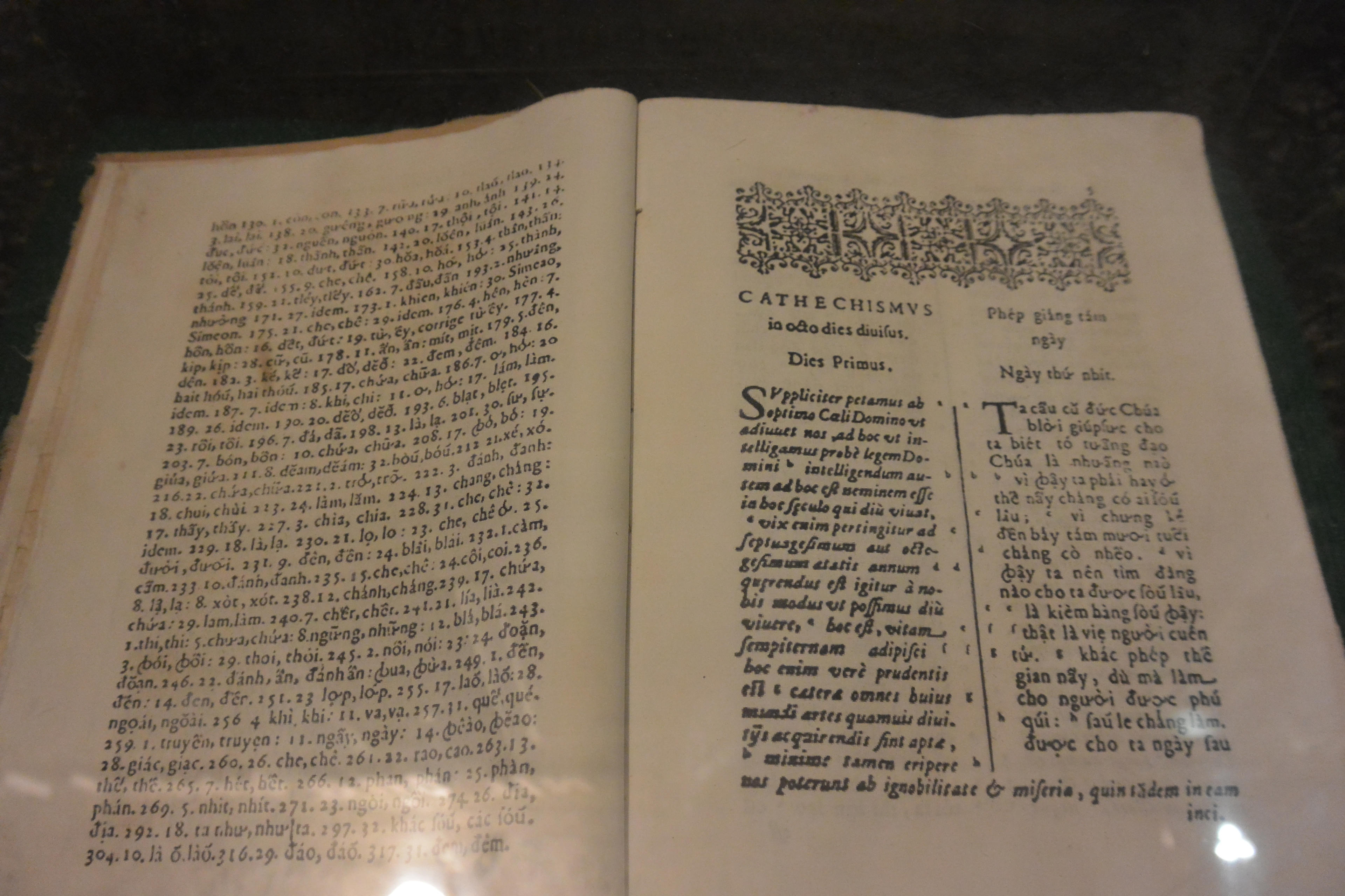 “Phép giảng 8 ngày” là cuốn giáo lý được in song ngữ bằng tiếng Latin (bên trái) và chữ Quốc ngữ sơ khai (bên phải). Có rất nhiều điều thú vị khi quan sát những “bước chập chững” đầu tiên của chữ Quốc ngữ trong cuốn sách này. Ví dụ: để ghi từ “sách”, người ta viết sayc, để ghi từ “nước mặn”, người ta viết nuocman, để ghi từ “ông nghè”, người ta viết ungue, ungué, ungné, ounghe, oungueh... Hay người ta viết ũ để ghi vần ung (ví dụ cũ = cung), viết oũ để ghi vần ông (ví dụ soũ = sông).