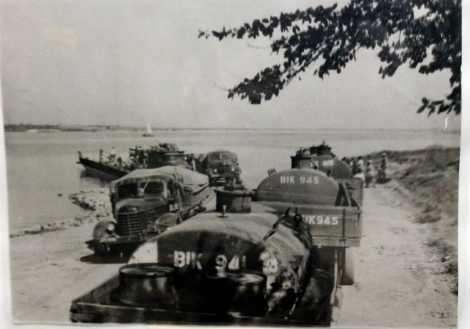| Phà Bến Thủy chở xe qua sông Lam. Trong những năm chiến tranh phá hoại, nơi đây được ví là ‘túi bom’, trọng điểm bắn phá ác liệt của không quân Mỹ. |