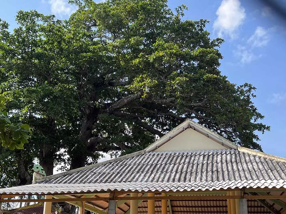 Bên cửa hông đình, một gốc bồ đề đồ sộ mọc lên, đâm xuyên qua mái.