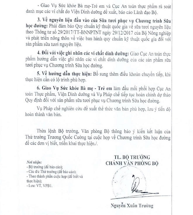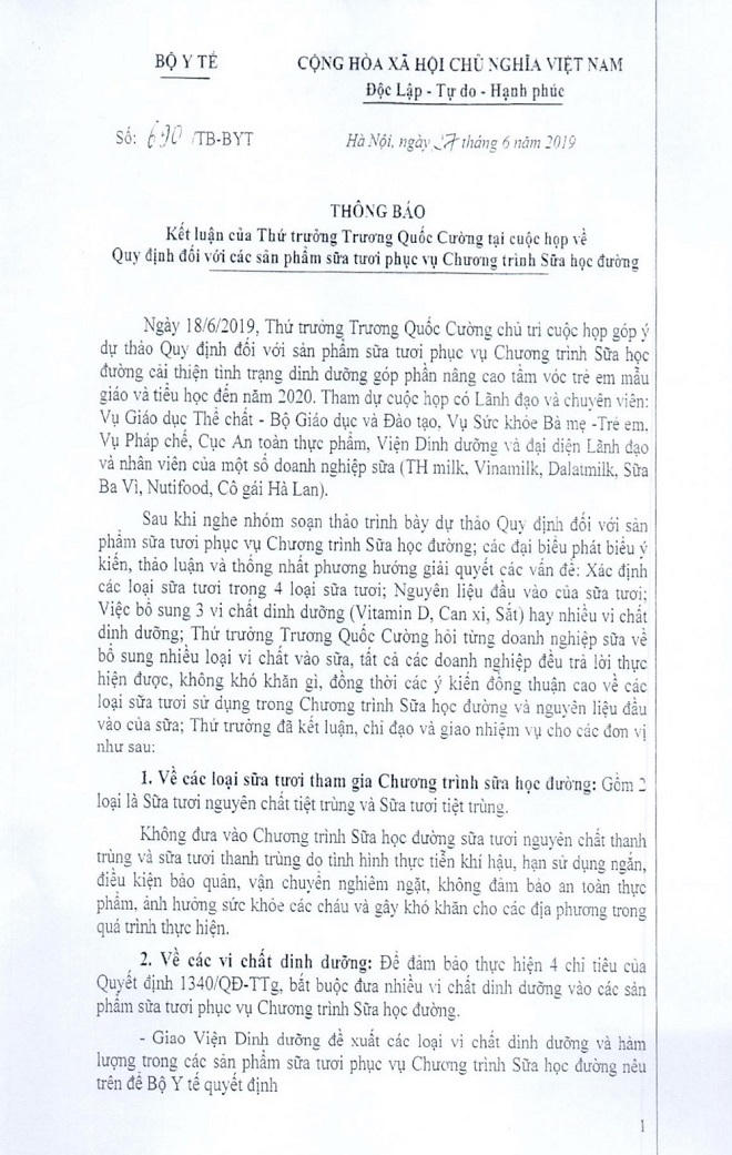 Do đó, ngày 18/6/2019, Thứ trưởng Bộ Y tế Trương Quốc Cường đã chủ trì cuộc họp góp ý Dự thảo Thông tư. Tại cuộc họp này, các Cục, Vụ, Viện có liên quan của Bộ Y tế cùng với các doanh nghiệp sản xuất - kinh doanh sữa đã thống nhất và có sự đồng thuận cao về các loại sữa tươi sử dụng trong Chương trình Sữa học đường và 21 vi chất dinh dưỡng bắt buộc bổ sung.