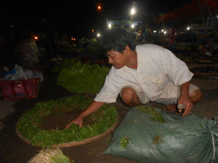 Anh kể, hành do gia đình trồng. Để chuẩn bị cho buổi chợ sớm, từ chiều hôm trước, anh đã ra đồng nhổ. Hành được rửa sạch sẽ rồi bó gọn gàng, chất sẵn nơi hiên nhà. Nửa đêm, anh chất hàng hóa lên chiếc xe máy cà tàng, lầm lũi chạy đến chợ đầu mối bán. Mỗi buổi chợ anh bán hết 30kg hành. Những hôm “buôn may bán đắt”, chỉ hơn một tiếng ngồi ở chợ, anh đã bán sạch. Hôm nào ế khách, cũng chỉ đến 5h sáng là xong.