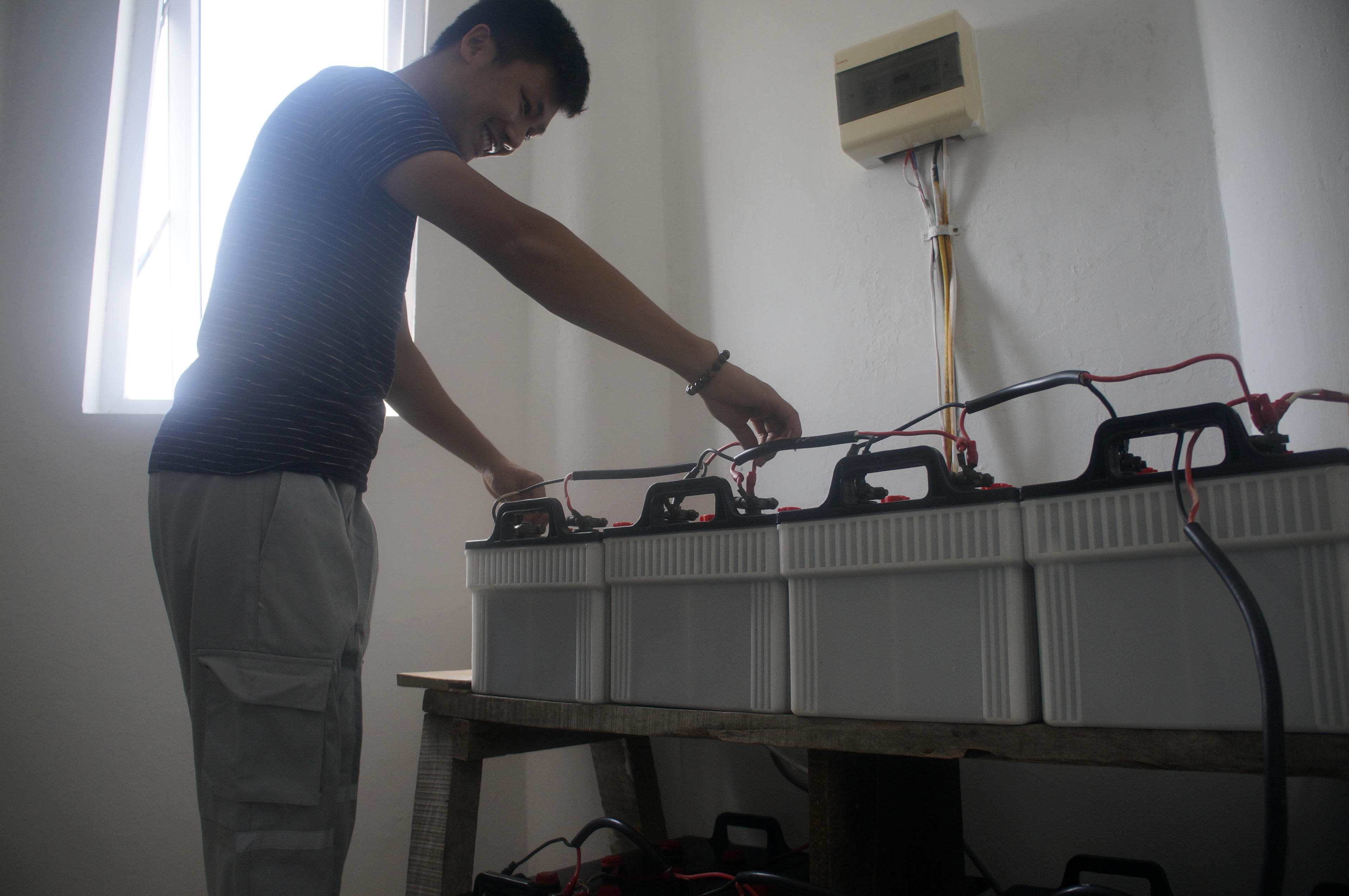 Anh Bùi Đức Tùng, công nhân trạm hải đăng An Bang thực hiện kiểm tra thiết bị máy phát, bảo đảm đèn luôn sáng. |
