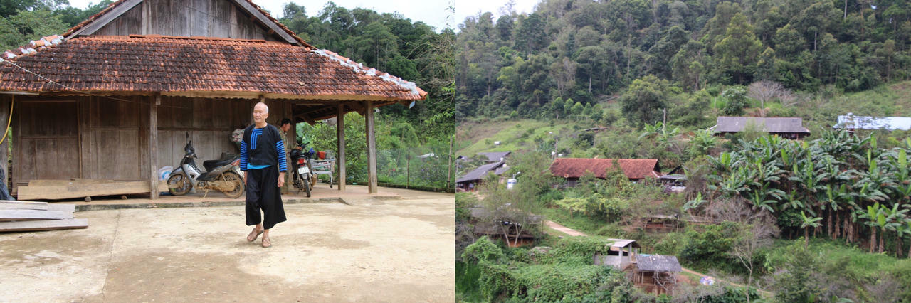 Ông Tráng Lao Lử sống trong ngôi nhà gỗ truyền người Mông ở bản Lao Khô, ngôi nhà nằm lấp ló bên triền đồi, xung quanh cây trái xanh tươi. |