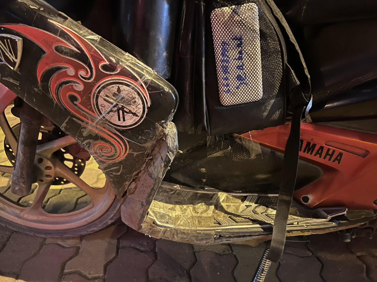 Chiếc xe máy của chị Phúc đã hỏng hóc nhiều chỗ, chị phải dán băng dính lại để cố định những phần bị vỡ. Xe vừa cũ lại vừa tốn xăng gây nhiều khó khăn cho chị trong công việc. |